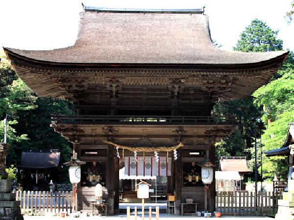 深い老樹の木立に囲まれた境内は、楼門をくぐると拝殿、千木のそびえる本殿、その左右に若宮社・三宮社が並んで建っています。とくに700年前に建造された本殿は、神社・仏閣・殿舎の三様式が合成された御上造と呼ばれる大変珍しい建物で県下神社建築の国宝の第一号です。長い歴史と信仰を感じさせる威厳と風格があります。