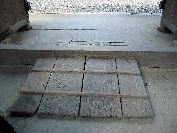 木製のスロープで滑り止めの横木があるので介助なしの車椅子では乗り越えがたいへんです。