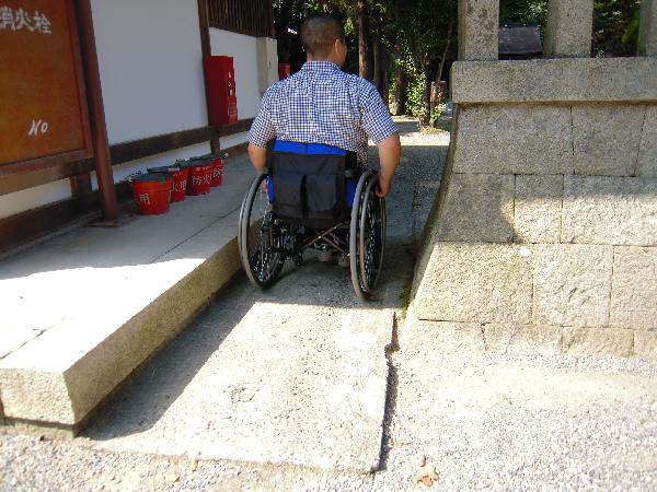 車椅子ユーザーは、南参道、西参道を通り過ぎた参道から境内に入る方が玉砂利の移動距離が短くてすみます。またこちらからの方が車椅子でも比較的に入りやすい通路があり便利です。