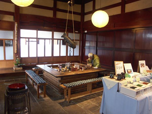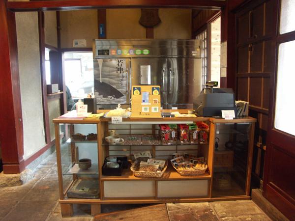 玄関入って右手には、そば粉を使った商品などが販売され、その奥でそばを打っておられます。また、左手の商品ケースでは、地元のお米や朝宮茶が販売されていました。