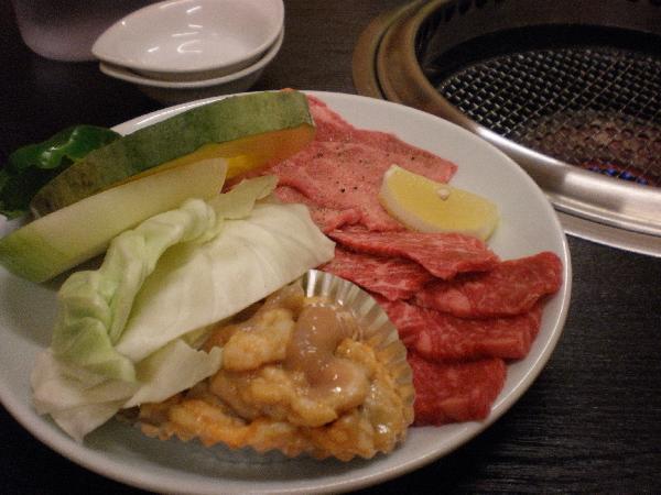 焼肉セット(上ロース・上タン・カルビ・こてっちゃんor鶏もも肉・野菜)です。 |