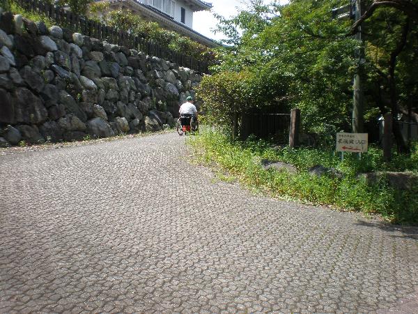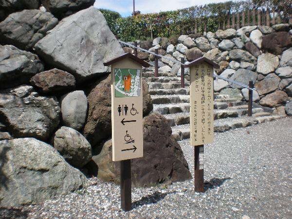 長浜城石垣下の車椅子トイレとスロープの案内看板です。