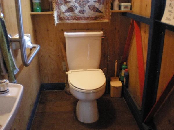 | 車椅子ごと入れます。ドアノブはレバー式で、手すりは向かって左側のみあります。 |