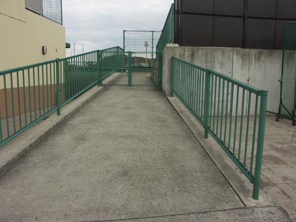 中央にあるゲートは、試合時に開放されます。スロープは少し勾配があり、長いので付き添いの人がいると安心です。ダッグアウトもバリアフリーになっています。